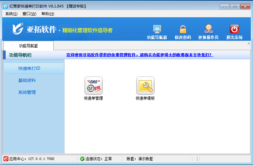 紅管家快遞單打印軟件是亞拓軟件針對(duì)企事業(yè)單位票據(jù)管理及打印需求而開發(fā)的一款快遞單套打軟件,主要包括快遞單管理、快遞單打印模板、快遞單打印、快遞單查詢等功能。