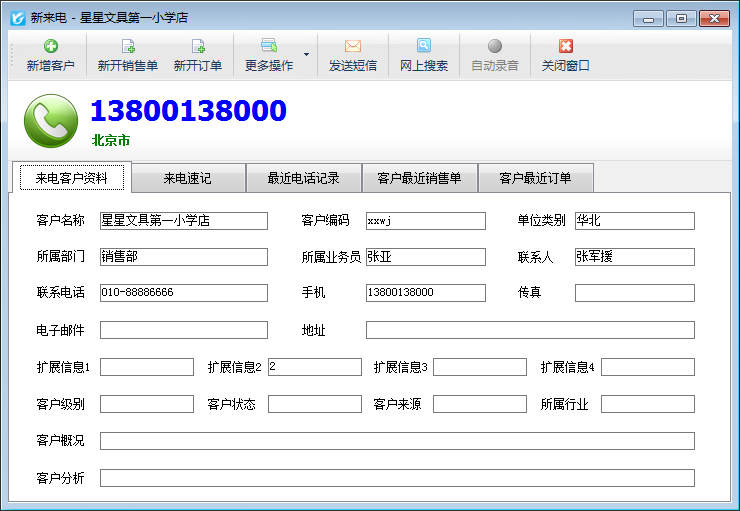 亞拓管理軟件(進銷存管理軟件)支持來電彈屏功能,客戶來電可以彈出窗口顯示客戶的詳細資料以及銷售情況,可以很好的提升客戶來電接待的滿意度。來電彈屏窗口如下圖所示: