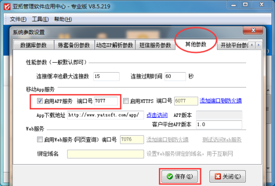 亞拓軟件手機APP是結合PC電腦端進行使用的,需要局域網下連接PC端應用中心的IP地址進行連接PC端的數據進行同步數據,手機APP占用客戶端連接數,相當于一個客戶端。以亞拓管理軟件為例示范下如何啟用手機APP 功能,打開電腦端的應用中心程序—》系統參數—》其他參數中勾選上“啟用APP服務”,手機端口默認是“7077”,然后點擊保存,如下圖1所示: