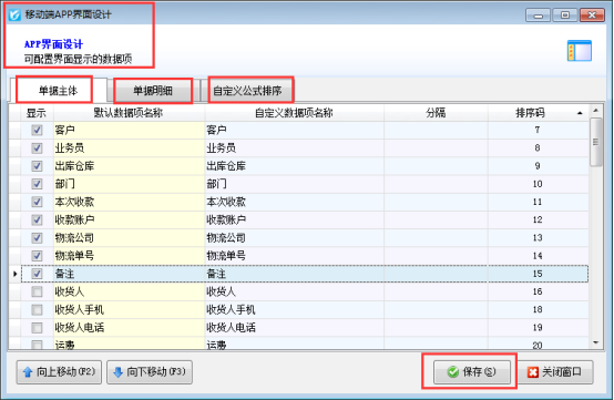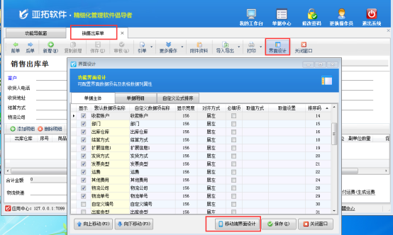 亞拓管理軟件對應的手機APP支持開銷售訂單、銷售出庫單、采購訂單、采購入庫單和查看采購單列表、銷售單列表及對基礎資料的維護等功能。手機APP的開單界面內容顯示需要在電腦端的界面設計中進行配置顯示,軟件支持自定義設置手機APP的界面顯示(單據主體內容、單據明細內容及計算公式),我們以銷售出庫單為例,示范下在界面設計中手機APP的銷售出庫單開單界面設計,如下圖4、圖5所示: