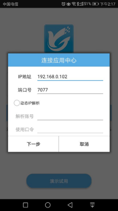 電腦端應用中心設置完成后,可以在手機應用平臺(如360手機應用)中下載手機APP 安裝程序進行安裝,手機APP 版本需要對應電腦端版本,安裝完手機APP后,手機APP需要和電腦端連接在同一局域網下,點擊登錄界面的選擇賬套,輸入主機IP地址,如下圖2所示: