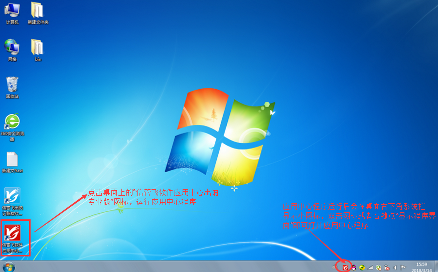 運行信管飛出納記賬軟件應用中心并打開信管飛出納記賬軟件應用中心程序界面,主機電腦上軟件安裝后會在桌面上自動創建“信管飛出納記賬軟件應用中心(紅色圖標)”及“信管飛出納記賬軟件即客戶端(藍色圖標)”的快捷方式,點擊“信管飛出納記賬軟件應用中心(紅色圖標)”即可運行信管飛出納記賬軟件應用中心,如下圖所示。