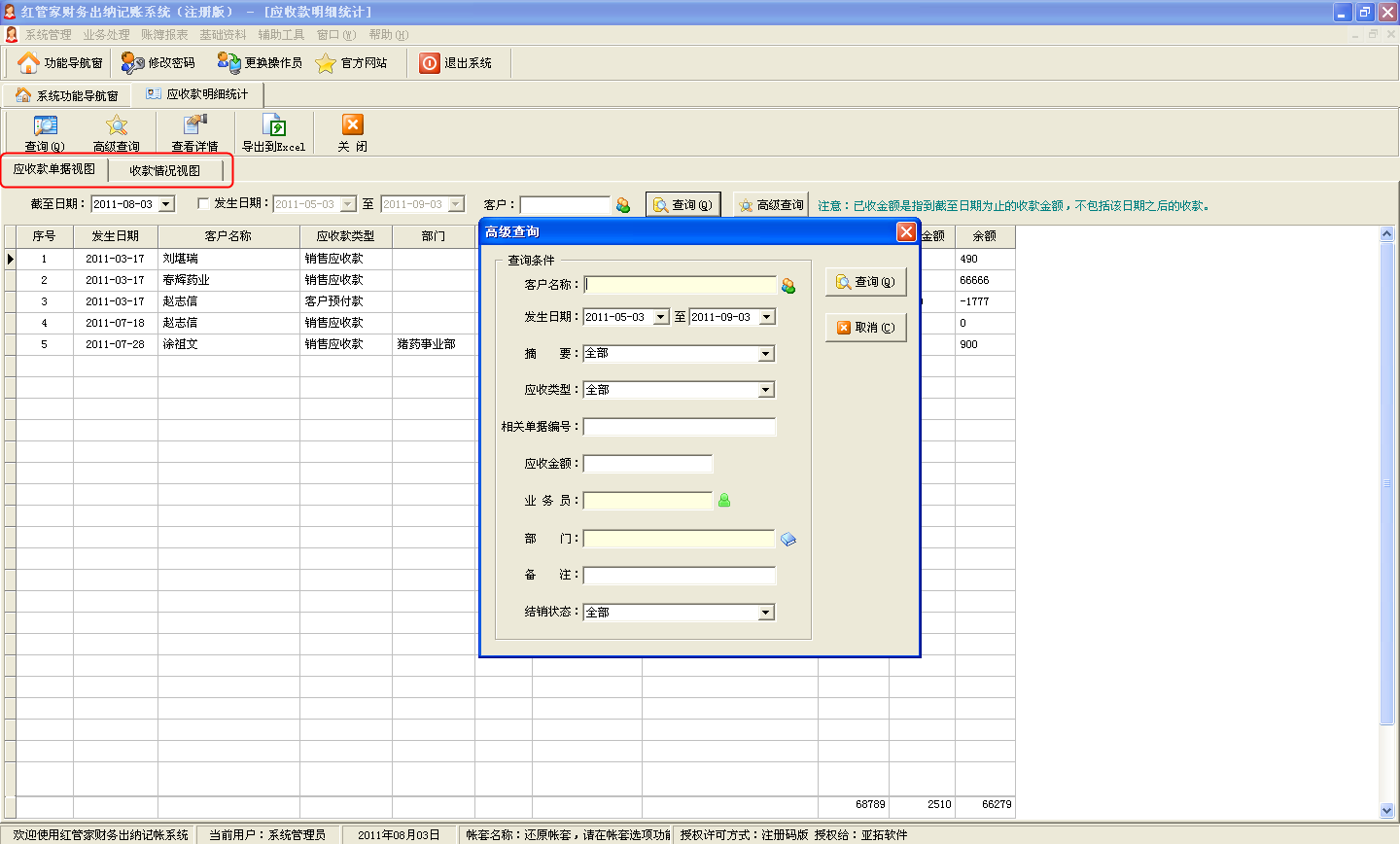 2、應(yīng)收款管理和應(yīng)付款管理增加部門列和高級(jí)查詢功能。