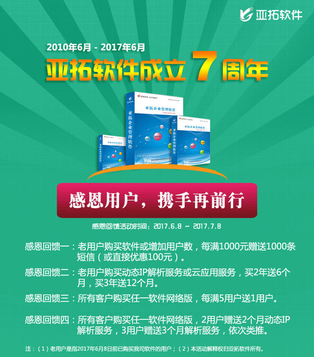 亞拓軟件成立于2010年,秉承“開發(fā)出穩(wěn)定、精致的創(chuàng)新性軟件產(chǎn)品,通過口碑營銷,實(shí)現(xiàn)業(yè)務(wù)高速發(fā)展”的發(fā)展理念,懷揣“用真誠和樸實(shí)重塑軟件服務(wù)新形象,讓中小企業(yè)都能用上專業(yè)、高效的精細(xì)化管理軟件”的使命和愿景,艱苦奮斗,在沒有廣告宣傳的情況下,通過口碑確立品牌,連續(xù)7年實(shí)現(xiàn)產(chǎn)品銷售的持續(xù)翻番和企業(yè)的快速發(fā)展! 為感謝廣大客戶的支持
