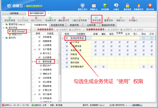 信管飛RMS專業版包含財務處理模塊,支持用戶高效、準確地登記會計憑證,為企業的財務管理提供堅實的數據基礎。在實際使用過程中,部分用戶反饋,當使用操作賬號登錄軟件進行賬務處理時,界面中未顯示生成業務憑證模塊,而系統管理員賬號登錄后該模塊卻能正常顯示,這是因為操作員沒有生成業務憑證權限導致的,本篇文章介紹下如何解決? 首先系統管理員賬號登錄,點擊“系統管理”—》“操作員及授權”進入操作員管理及授權界面,選擇操作員“張亞”,點擊功能模塊權限,選擇賬務處理,勾選“生成業務憑證”模塊,勾選后點擊保存,如圖:
