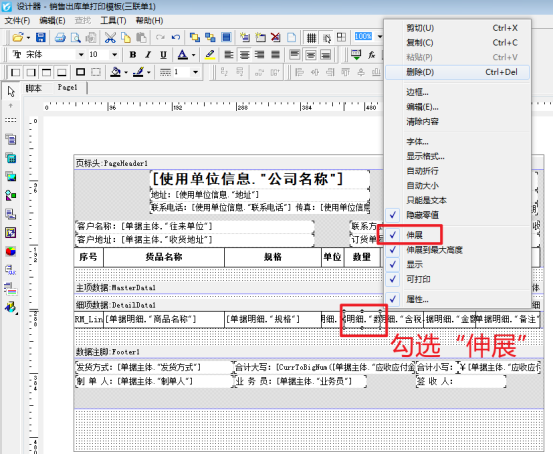 信管飛軟件具備強大的單據打印功能,不僅支持用戶打印單據內容,還支持用戶根據自身需求自定義打印模板,靈活滿足多樣化的業務場景。不過,在實際使用過程中,有部分用戶反饋,在進行打印預覽操作時,出現了單據中部分明細內容的文本框無法完整顯示的問題,本篇文章介紹下如何解決? 新增單據,打印預覽界面如下: 解決方法如下:開單界面,點打印-打印格式設計,設計格式,進入模板設計器界面,依次選中“數量”“金額”文本框,鼠標右鍵把“伸展”勾選上,如圖: &nbs