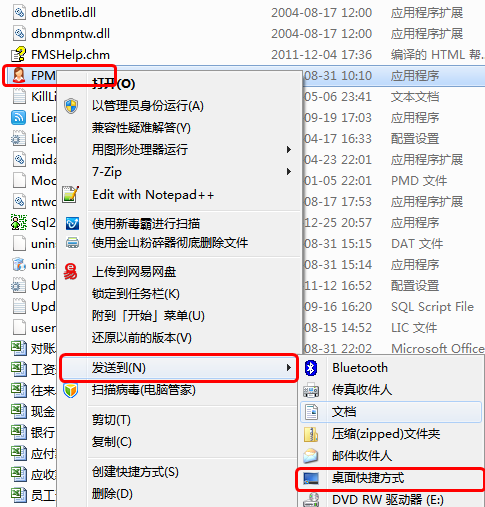 2、重新建立快捷方式,在修改后目錄下的FPMS.exe文件上,點鼠標(biāo)右鍵,再點“發(fā)送到”-》“桌面快捷方式”,發(fā)送快捷方式到桌面。默認(rèn)快捷方式為“FPMS.exe - 快捷方式”,可以將快捷方式名改為“紅管家財務(wù)出納記賬系統(tǒng)”。桌面上原來的快捷方式是指向修改前目錄的,可以刪除掉。