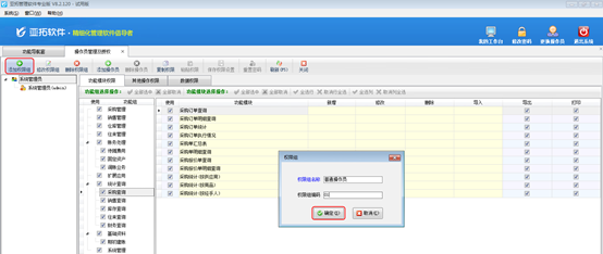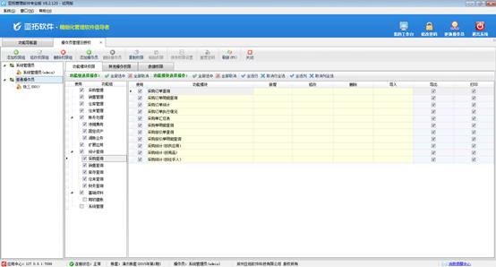 操作員及授權(quán)實(shí)現(xiàn)對(duì)操作員的管理和權(quán)限分配。權(quán)限分為功能模塊權(quán)限、明細(xì)操作權(quán)限、其他操作權(quán)限、數(shù)據(jù)權(quán)限等。不同版本的系統(tǒng)功能權(quán)限的種類是不同的,另外部分權(quán)限(如倉(cāng)庫(kù)權(quán)限、資金賬戶權(quán)限)需要在“系統(tǒng)參數(shù)配置”中啟用相應(yīng)的參數(shù),才可以使用。