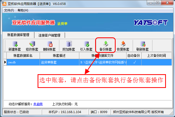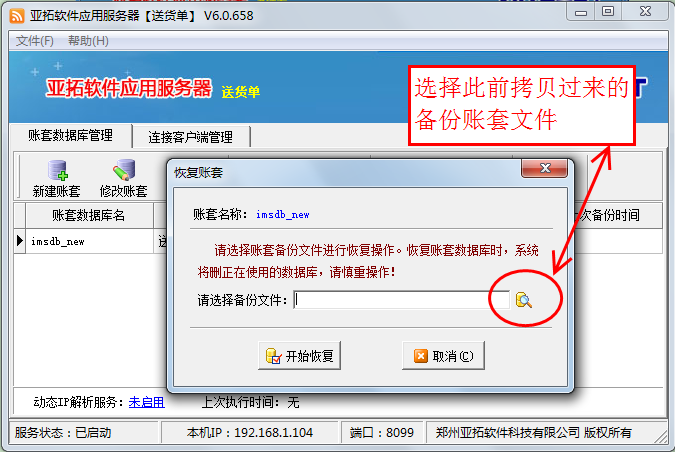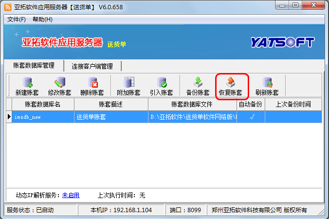 在新主機電腦上安裝軟件,打開亞拓軟件應用服務器,然后點擊“新建賬套”,執行新建賬套操作,賬套名為此前備份的賬套名,新建賬套完成后,選擇此新建的賬套,點“恢復賬套”,選擇此前拷貝過來的備份賬套文件進行恢復數據,數據恢復后,在登錄窗口選擇賬套登錄,檢查下數據是否完全恢復。