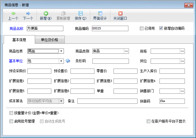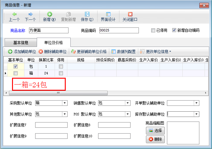 點擊“單位及價格”,進入單位及價格界面,添加輔助單位,設置基本單位與輔助單位之間的換算關系,如商品“方便面”的基本單位“包”與輔助單位“箱”之間的換算關系為一箱等于24包,如下圖二所示。