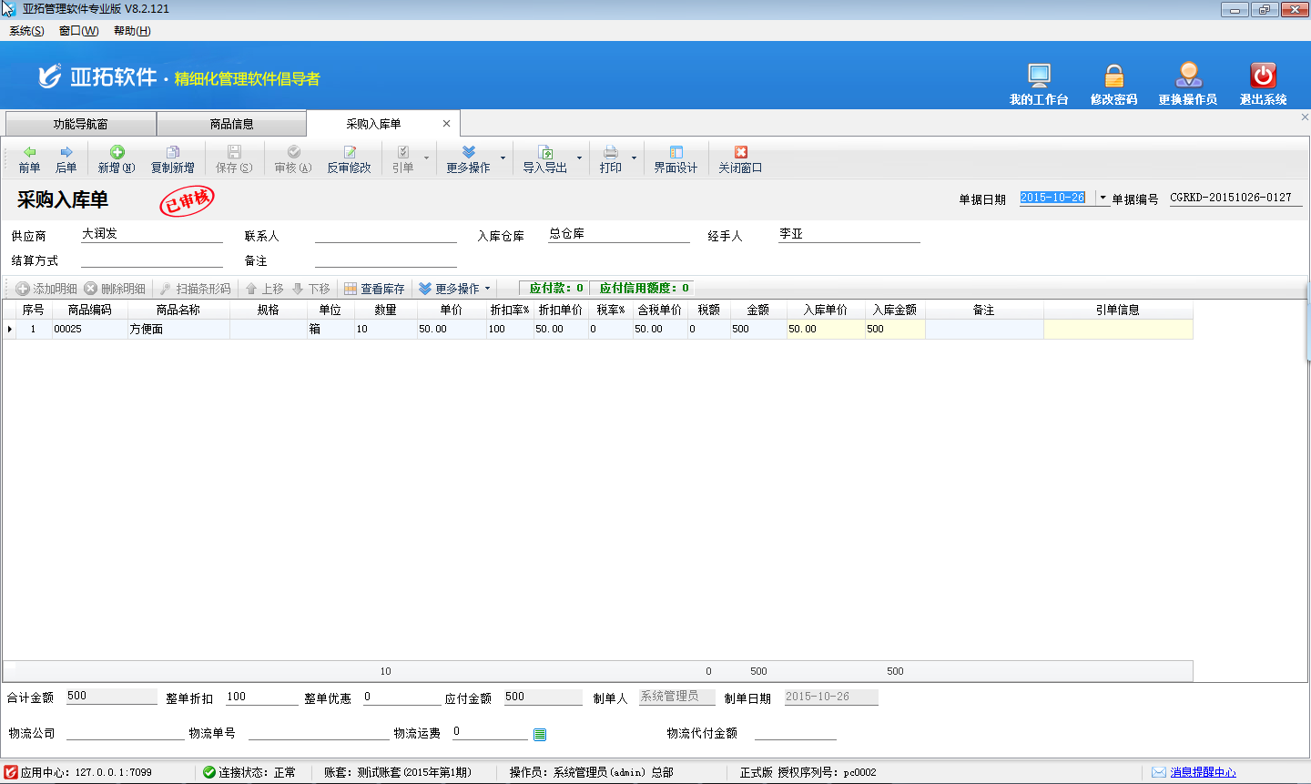 二、新開采購入庫單,采購商品“方便面”十箱,根據我們提前設置的換算關系可知:十箱等于240包,如下圖三所示。