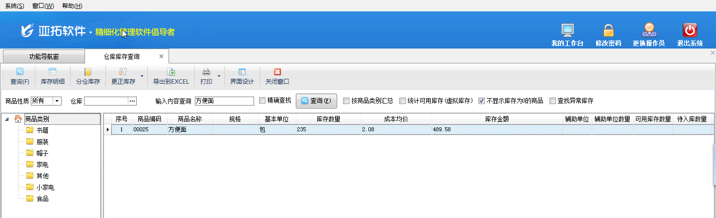 四、在功能導航窗點“倉庫管理”——》“相關統計查詢”——》“倉庫庫存查詢”,選擇商品“方便面”進行查詢,可查到商品“方便面”此時的庫存為235包,如下圖五所示。