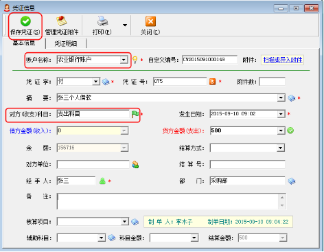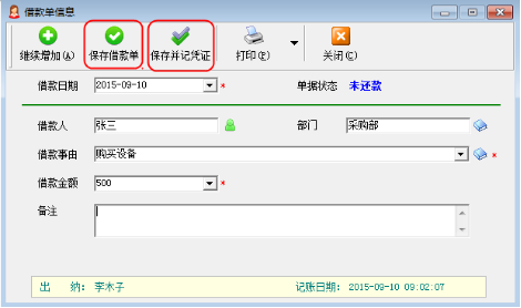 填寫(xiě)完借款信息后點(diǎn)擊“保存借款單”,然后點(diǎn)擊“保存并記憑證”,如圖2所示,填寫(xiě)憑證信息后保存憑證。