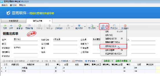 以亞拓管理軟件為例,在銷售出庫單界面上點“打印”—》“打印格式設計”進入“銷售出庫單打印”窗口。如下圖所示:
