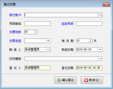 用于增加一張或多張支票。在“支票管理”界面,單擊工具欄的“登記支票”按鈕,彈出如下窗口: