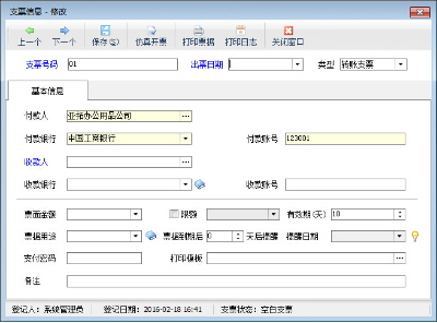 用于修改一張支票的信息。在“支票管理”界面,單擊工具欄中的“修改支票”按鈕,彈出修改支票窗口,修改支票信息后點(diǎn)擊“保存”按鈕進(jìn)行保存。修改支票的界面可以進(jìn)行仿真開票、打印支票,可以查看打印日志。
