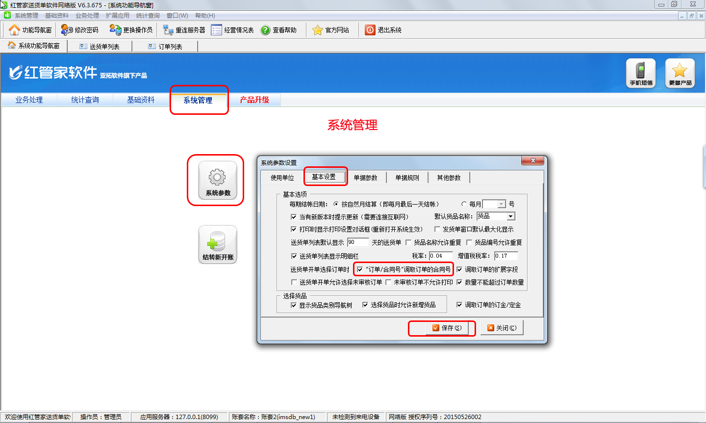 在功能導航窗點擊“系統管理”——》“系統參數”打開系統參數設置界面,在“系統參數”——》“基本設置”界面,打勾選中“訂單/合同號調取訂單的合同號”選項啟用“訂單合同號調取訂單的合同號”的功能,配置完之后點擊“保存”按鈕保存設置即可,如下圖所示:
