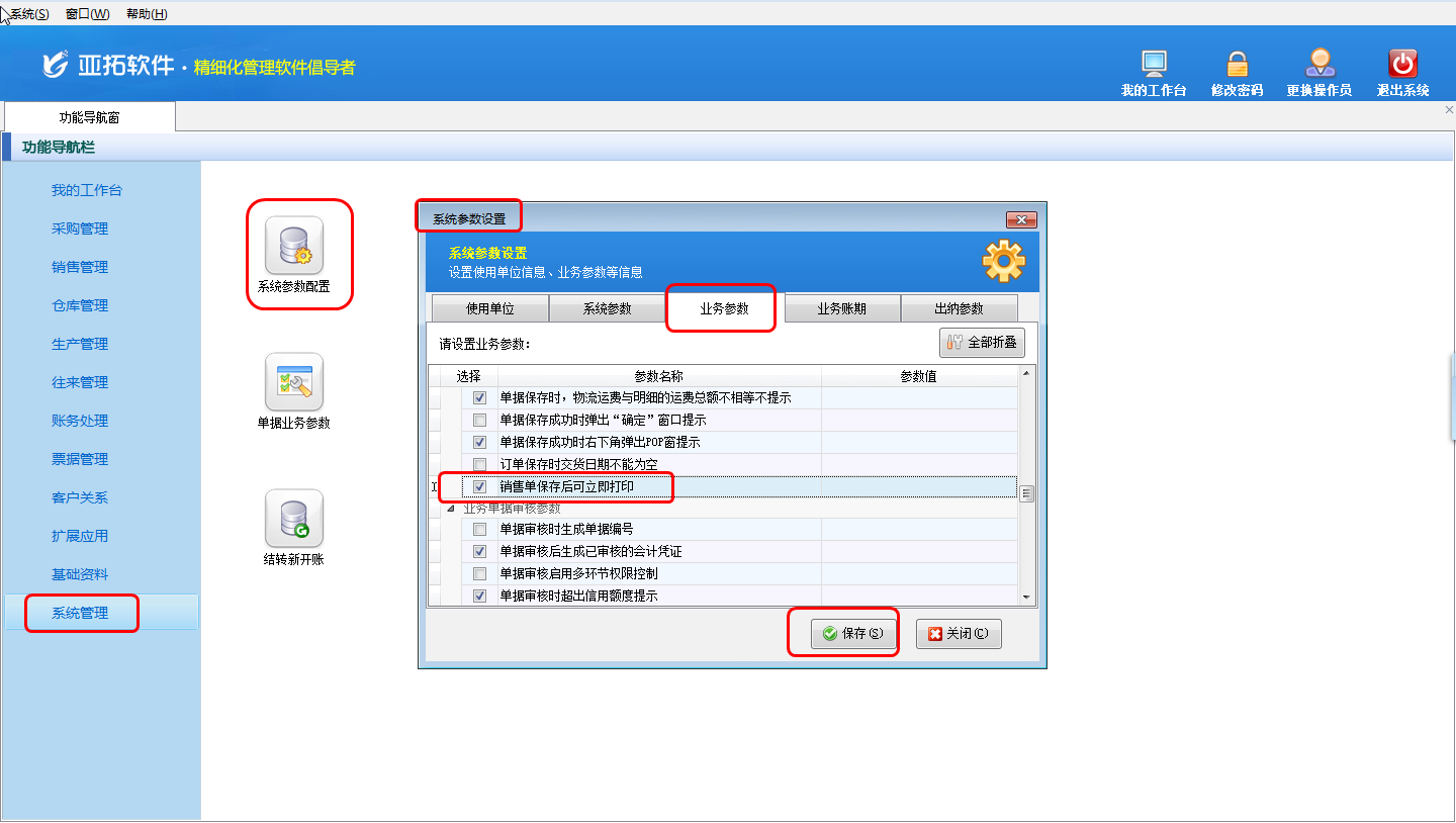 在功能導航窗點擊“系統管理”——》“系統參數配置”打開系統參數配置界面,在“系統參數設置”——》“業(yè)務參數”——》“業(yè)務單據保存參數”中打勾選中“銷售單保存后可立即打印”選項啟用“銷售單保存后可立即打印”此功能,配置完之后點擊“保存”按鈕保存設置即可,如下圖所示。