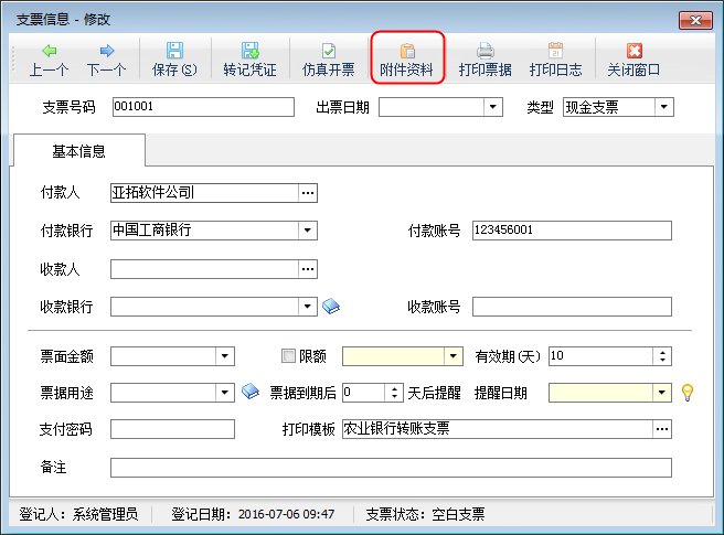 紅管家票據(jù)打印軟件開單后,自動(dòng)保存數(shù)據(jù),方便以后查閱或打印,填開支票、承兌匯票、快遞單以及其他票據(jù)時(shí),軟件支持添加文檔、圖表等附件資料,可掃描或?qū)肱c票據(jù)相關(guān)的電子文件,方便用戶更全面、直接地查詢票據(jù)的全過(guò)程,有利于企業(yè)票據(jù)管理控制。下面我們介紹一下附件資料管理功能的使用。