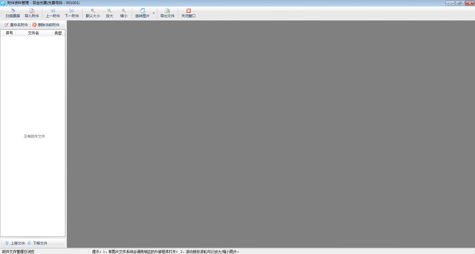 在填開或者修改票據(jù)的界面,如圖1所示,點(diǎn)擊工具欄中的“附件資料”按鈕,可以進(jìn)入“附件資料管理”界面,如圖2所示,可掃描或?qū)肱c票據(jù)相關(guān)的電子文件。