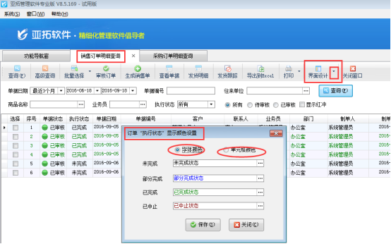 為了更清晰的顯示訂單的執行狀態和滿足客戶的自定義需求,亞拓管理軟件的訂單執行狀態的顏色可自由設定顏色顯示。