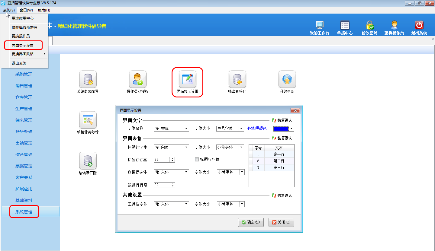 亞拓管理軟件(精細(xì)化管理軟件、進(jìn)銷存管理軟件、記賬軟件)、紅管家送貨單軟件、紅管家倉(cāng)庫(kù)管理軟件、紅管家票據(jù)打印軟件、紅管家出納記賬軟件中都可以對(duì)界面文字(界面文字僅對(duì)業(yè)務(wù)單據(jù)生效)以及界面表格字體大小進(jìn)行設(shè)置,本篇文章以亞拓管理軟件專業(yè)版為例詳細(xì)介紹下在軟件內(nèi)如何調(diào)整字體大?