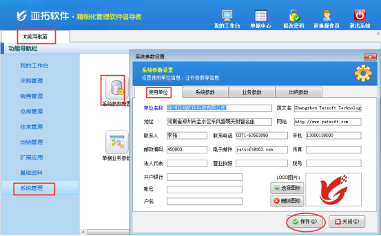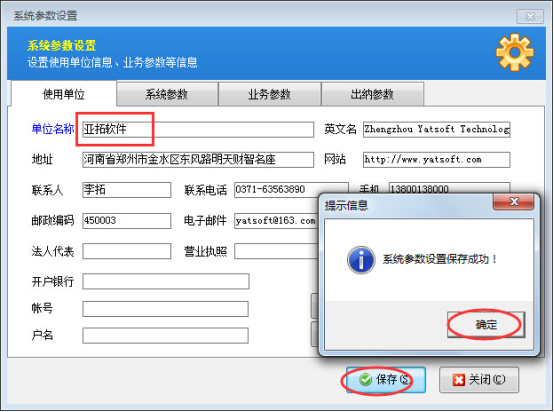 在“系統(tǒng)管理”—》“系統(tǒng)參數(shù)配置”中修改單位名稱為“亞拓軟件”,修改后記得保存。保存會(huì)提示“系統(tǒng)參數(shù)設(shè)置保存成功”。具體如下圖所示: