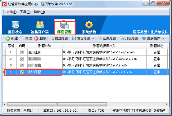 賬套即賬套數據庫,這是一個從會計業務引申出來的概念,賬套數據庫中存儲業務數據。使用軟件前建議新增加一個賬套,用于重新錄入和管理數據。本軟件的賬套是集中在主機電腦上的應用中心程序(紅色圖標)上進行的。我們公司的亞拓管理軟件紅管家送貨單軟件紅管家出納軟件等都支持新建多賬套使用。以紅管家送貨單為例,示范下如何進行新建賬套和選擇新賬套使用軟件?