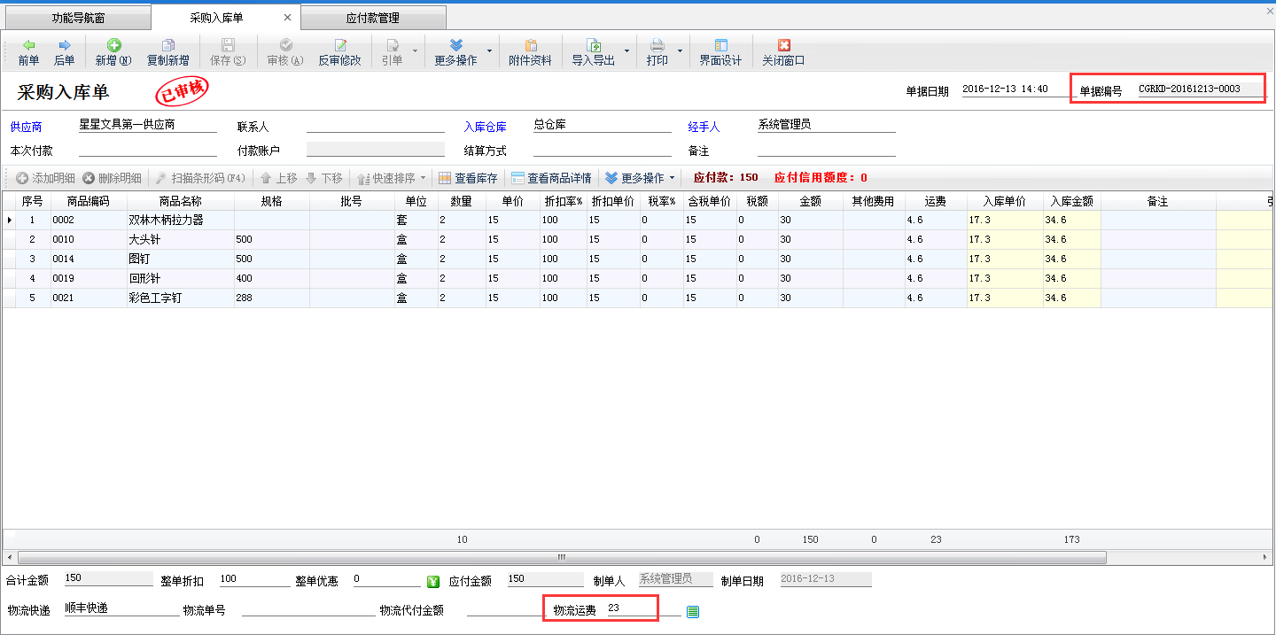 設(shè)置完成之后,我們在采購管理內(nèi)新增采購入庫單,并錄入運費(注意:物流運費需要和明細內(nèi)的運費總額相等才可以保存成功,不相等時單據(jù)不能保存),如下圖二所示。