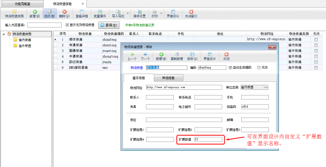 在功能導航窗點擊“基礎資料”—》“物流快遞”打開物流快遞信息界面,修改“順豐快遞”運費為23元(可將物流快遞運費維護在“擴展數值(數據項英文名稱:extnum1)”內),如下圖一中所示。