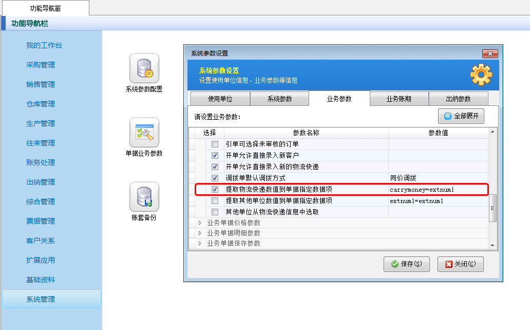 在功能導航窗點擊“系統管理”—》“系統參數設置”—》“業務參數”可以進入到“業務參數”配置界面,在業務單據相關參數內打鉤啟用“提取物流快遞數值到單據指定數據項”參數,并設置參數值(格式如:extnum1(提取到擴展數值1)、extnum1=extnum1(提取到擴展數值1)或carrymoney=extnum1(提取到運費字段)),默認為“carrymoney=extnum1(提取到運費字段)”,如下圖二中所示。