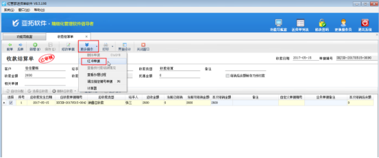 在功能導航窗點“業務處理”—》“收款單列表”,找到需要刪除的收款結算單,雙擊打開收款結算單,進入“收款結算單”界面,如圖2所示,點擊“更多操作”—》“紅沖單據”,單據會由“已審核”變為“已紅沖”狀態。