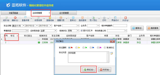 亞拓管理軟件和紅管家倉庫管理軟件都可以對應(yīng)收款管理、應(yīng)付款管理進(jìn)行標(biāo)記備注。送貨單軟件的應(yīng)收款管理中也可以對應(yīng)收款進(jìn)行標(biāo)記備注。下面我們以亞拓管理軟件專業(yè)版為例,介紹對應(yīng)收款管理標(biāo)記備注的操作步驟(應(yīng)付款和應(yīng)收款操作一致)。