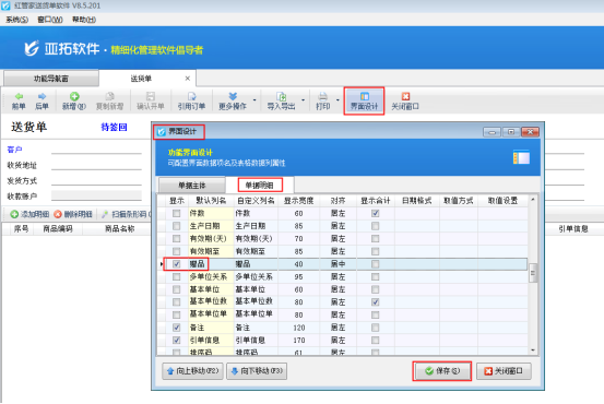 在功能導航窗點“業務處理”—》“新開送貨單”即可進入“送貨單”界面,如圖1所示,軟件默認不顯示“贈品”列,需要到界面設計里面顯示出來。點擊“界面設計”—》“單據明細”,勾選“贈品”,然后點擊“保存”進行保存。