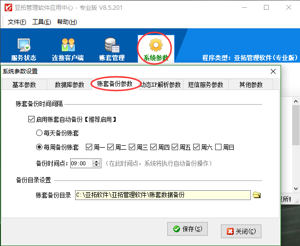 亞拓管理軟件、紅管家送貨單軟件紅管家出納記賬軟件、紅管家倉庫管理軟件紅管家票據軟件都支持設置賬套自動備份,我們強烈建議啟用自動備份功能,以便賬套出現問題的時候從賬套備份文件中恢復數據。本節我們以亞拓管理軟件為例詳細介紹一下如何啟用賬套自動備份功能?