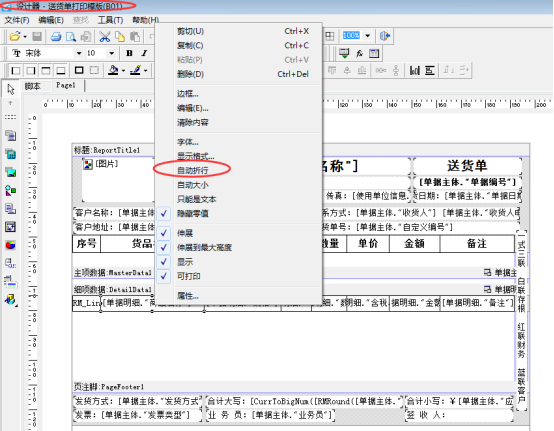 在送貨單界面選擇“打印”—》“打印格式設計”進入打印格式設計界面,如當前模板為默認模板則直接在工具欄點擊“設計格式”,不是默認模板,需要先點擊下模板進行選定模板后打開工具欄的“設計格式”,進入打印模板設計器界面,選擇需要折行的文本框,點擊鼠標右鍵,彈出一個界面,對“自動折行”項進行勾選,然后保存模板即可。如下圖2所示:
