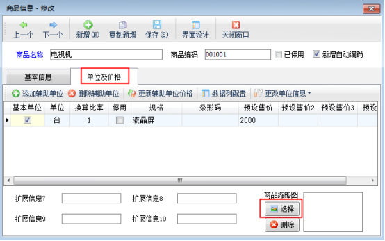 “商品信息修改”窗口點擊“單位及價格”,然后點擊“選擇”按鈕,可以選擇已準備好的圖片,支持jpg、png等格式的圖片,建議圖片大小在100K以內,圖片大小過大會影響商品打開速度。選擇圖片后,點擊“保存”按鈕對商品信息保存,如圖2所示。如果需要更換商品圖片,可以點擊“刪除”按鈕刪除商品圖片,然后再從新上傳圖片即可。