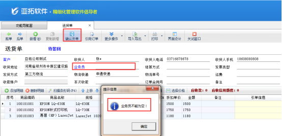 以送貨單軟件為例,示范下如果設(shè)置開單業(yè)務(wù)員允許為空。軟件安裝完成,系統(tǒng)參數(shù)設(shè)置默認(rèn)業(yè)務(wù)員不允許為空,正常開送貨單,未在單據(jù)主體中輸入“業(yè)務(wù)員”,商品輸入完成后點(diǎn)擊確認(rèn)開單按鈕,會提示“業(yè)務(wù)員不能為空”,如下圖1所示: