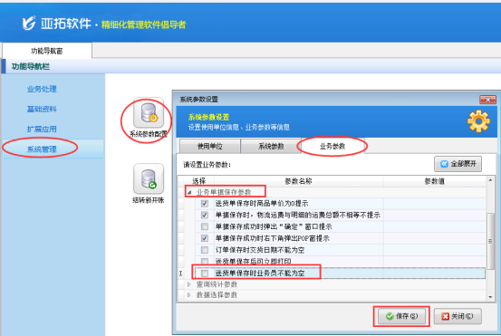 在功能導(dǎo)航窗選擇系統(tǒng)管理—》系統(tǒng)參數(shù)配置,即可進(jìn)去“系統(tǒng)參數(shù)設(shè)置界面”,點(diǎn)擊業(yè)務(wù)參數(shù),在業(yè)務(wù)單據(jù)保存參數(shù)中找到“送貨單保存時業(yè)務(wù)員不能為空”參數(shù),把前邊的勾選符號去掉,然后保存,如圖2所示: