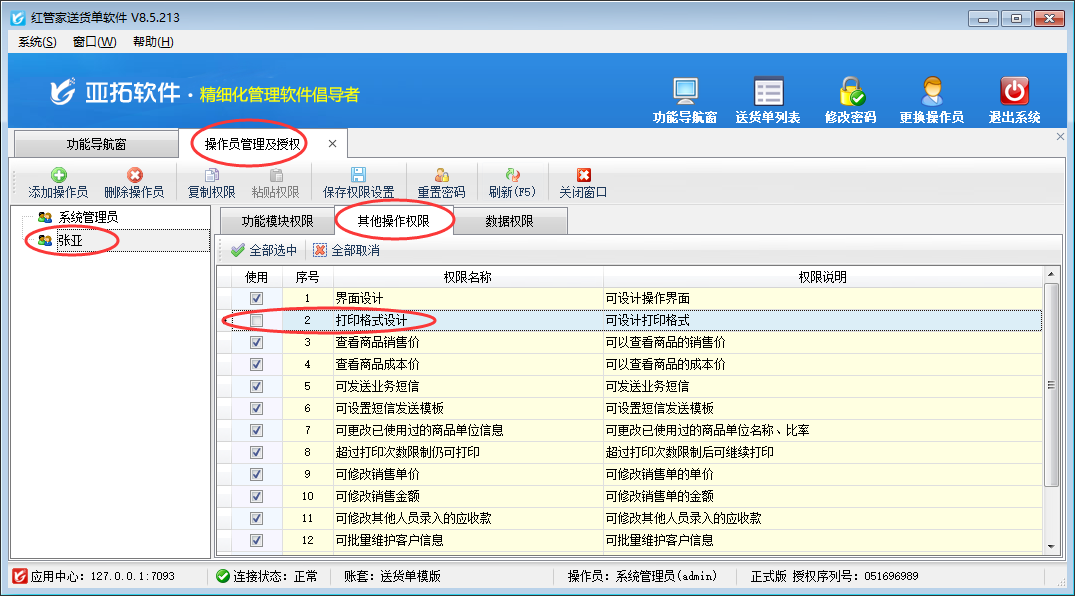 在功能導(dǎo)航窗點“系統(tǒng)管理”→“操作員及授權(quán)”即可進(jìn)入“操作員管理及授權(quán)”界面,選中操作員賬號,在“其他操作權(quán)限”界面將“打印格式設(shè)計”權(quán)限打鉤取消,然后保存權(quán)限設(shè)置,如下圖一所示,設(shè)置操作員“張亞”沒有“打印格式設(shè)計”權(quán)限。