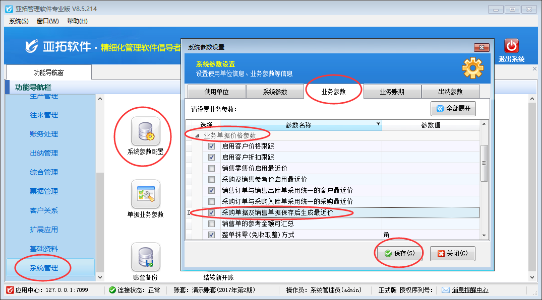 在功能導(dǎo)航窗點(diǎn)擊“系統(tǒng)管理”——》“系統(tǒng)參數(shù)配置”——》“業(yè)務(wù)參數(shù)”可以進(jìn)入到“業(yè)務(wù)參數(shù)”配置界面,在業(yè)務(wù)單據(jù)價(jià)格參數(shù)內(nèi)打勾啟用“采購單據(jù)及銷售單據(jù)保存時(shí)生成最近價(jià)”參數(shù),如下圖一所示。
