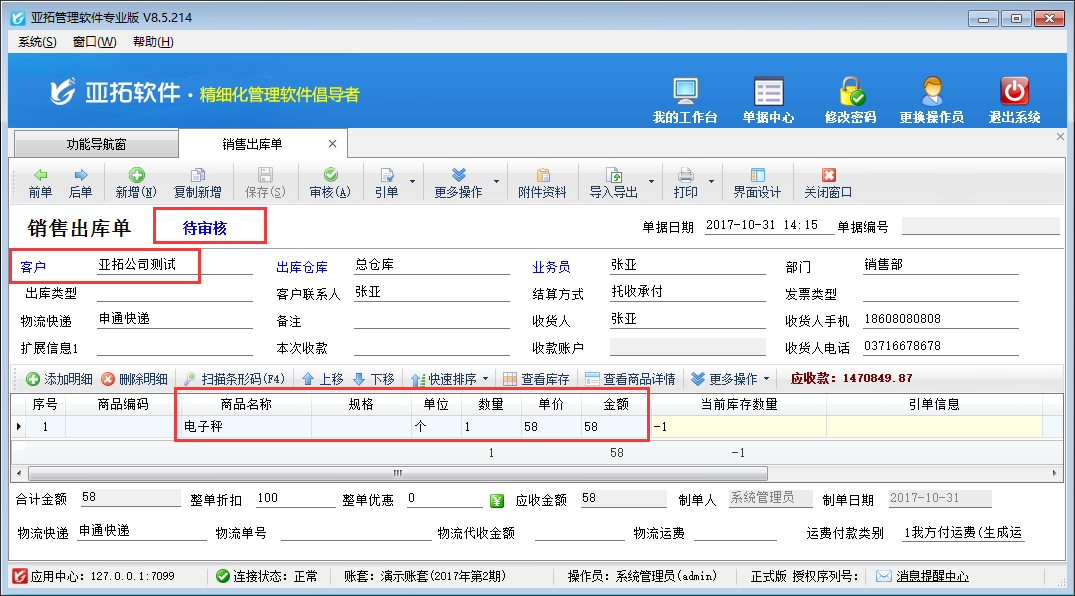 設(shè)置完成后,在功能導(dǎo)航窗點(diǎn)擊“銷售管理”→“銷售出庫單”,我們先新增一個(gè)銷售出庫單,錄入商品銷售價(jià),如下圖二所示,以單價(jià)58元銷售給客戶亞拓公司測試“電子秤”一臺,然后在功能導(dǎo)航窗點(diǎn)擊“基礎(chǔ)資料”→“客戶價(jià)格信息”打開客戶價(jià)格信息表,對“電子秤”的最近銷售價(jià)格進(jìn)行查詢,可以看到“亞拓公司測試”的最近銷售價(jià)格為58元,如下圖三所示。