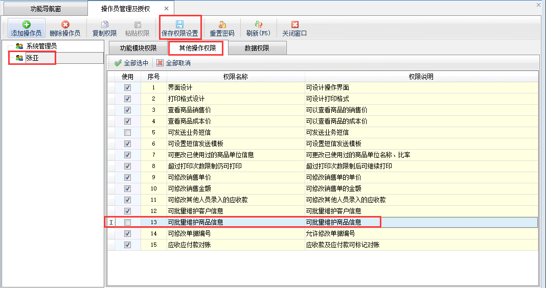 在功能導航窗點“系統(tǒng)管理”→“操作員及授權”即可進入“操作員管理及授權”界面,選中操作員賬號,在“其他操作權限”界面將“可批量維護商品信息”權限打鉤取消,然后保存權限設置,如下圖一所示,設置操作員“張亞”沒有“可批量維護商品信息”權限。
