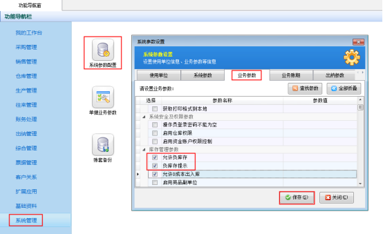 在功能導航窗點擊“系統管理”—》“系統參數配置”—》“業務參數”,即可進入到“業務參數”配置界面,在庫存管理參數內找到“允許負庫存”、“負庫存提示”參數,勾選這兩個參數,然后保存,如下圖1所示: