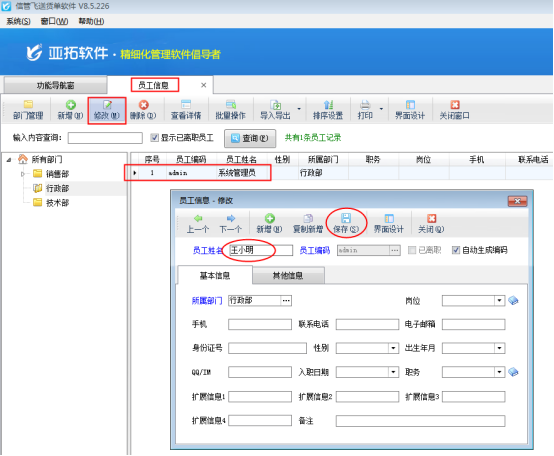 在功能導(dǎo)航窗點(diǎn)擊“基礎(chǔ)資料”——》“員工信息”,打開員工信息界面,選擇“系統(tǒng)管理員”,點(diǎn)擊“修改”按鈕,如圖3所示,將“系統(tǒng)管理員”修改為“王小明”,修改之后點(diǎn)擊“保存”按鈕。然后重新登錄軟件時(shí),即可看到“系統(tǒng)管理員”已更改為“王小明”,如圖4所示。