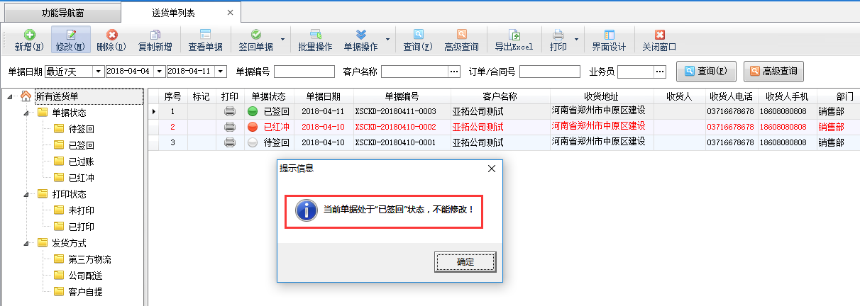 信管飛送貨單軟件通過(guò)狀態(tài)控制實(shí)現(xiàn)簡(jiǎn)單的流程管理(待簽回(新開(kāi)單)-》已簽回(業(yè)務(wù)員送貨回來(lái)或者客戶已簽收快遞)-》已過(guò)賬(財(cái)務(wù)確認(rèn)已收到貨款)),“已簽回”及“已過(guò)賬”的單據(jù)無(wú)法修改,但是部分情況下可能會(huì)需要修改“已簽回/已過(guò)賬”的單據(jù),如何修改呢?下面詳細(xì)介紹一下操作過(guò)程。