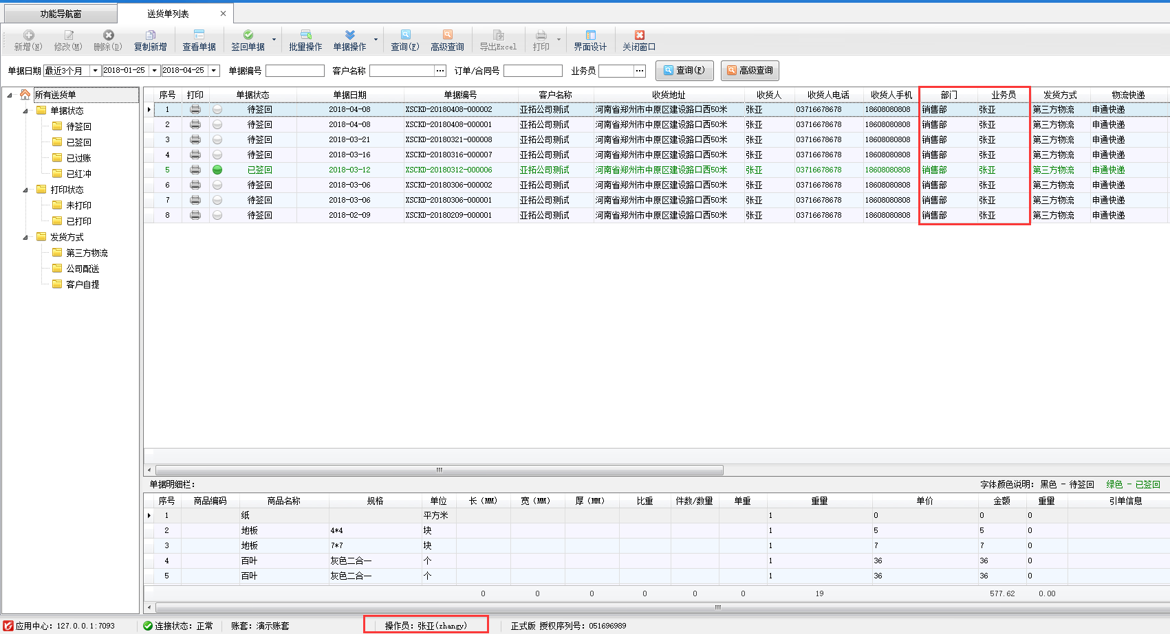 設置完成之后,我們用操作員“張亞”登錄軟件查看送貨單列表,可以看到可查看到的送貨單單據僅為本部門人員所開數據,如下圖二所示。