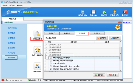 以信管飛倉庫管理軟件為例,示范下如何設置審核時生成單據編號。在功能導航窗選擇“系統管理”—》“系統參數配置”—》“業務參數”,即進入到業務參數配置界面,在“業務參數審核參數”中勾選啟用“單據審核時生成單據編號”參數,保存設置,如下圖1所示: