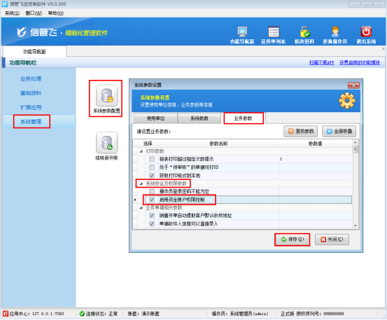 在功能導航窗選擇“系統管理”—》“系統參數配置”—》“業務參數”,進入業務參數設置界面,在“系統安全及權限參數”中勾選“啟用資金賬戶權限”參數,然后保存,如圖1所示。