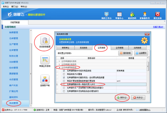 在功能導航窗點擊“系統(tǒng)管理”—》“系統(tǒng)參數(shù)配置”—》“業(yè)務參數(shù)”,即可進入到“業(yè)務參數(shù)”配置界面,在業(yè)務單據(jù)明細參數(shù)內(nèi)找到“在單據(jù)明細中同一商品可錄入多行”參數(shù),把這個參數(shù)的勾選去掉,然后保存,如下圖二所示。